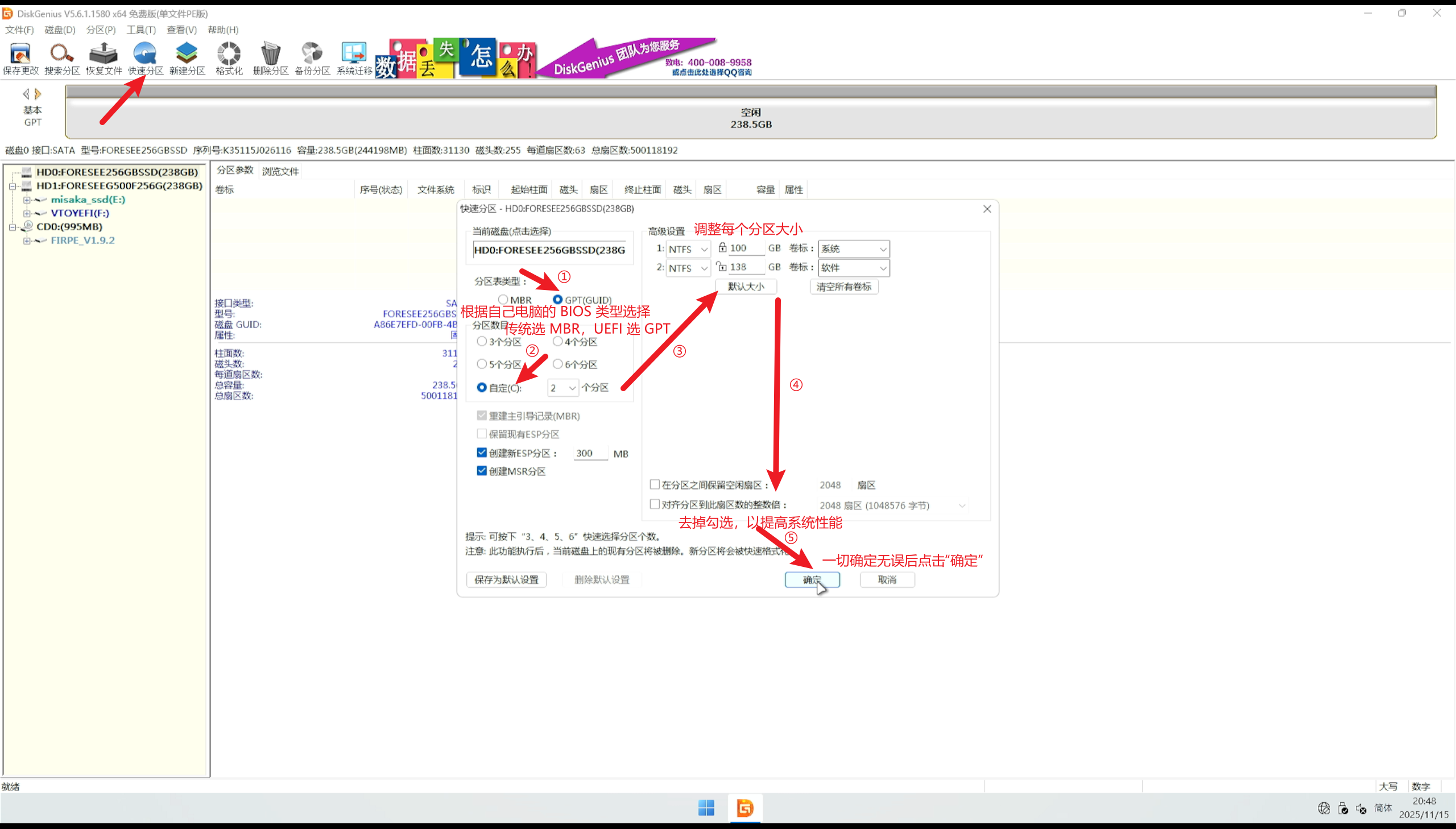 - 点击“快速分区”,然后根据图片中备注的步骤设定分区信息,最后点击“确定”