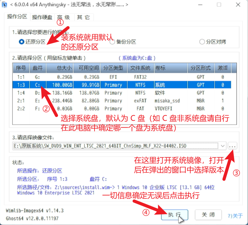 - 分区后,打开桌面的“CGI”软件,然后根据图片中备注的步骤做好安装系统前的设定