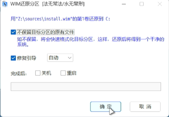 - 一切无误后,点击“确定”即可开始安装系统。安装完成后,CGI 软件会自动退出。我们需要将系统重启